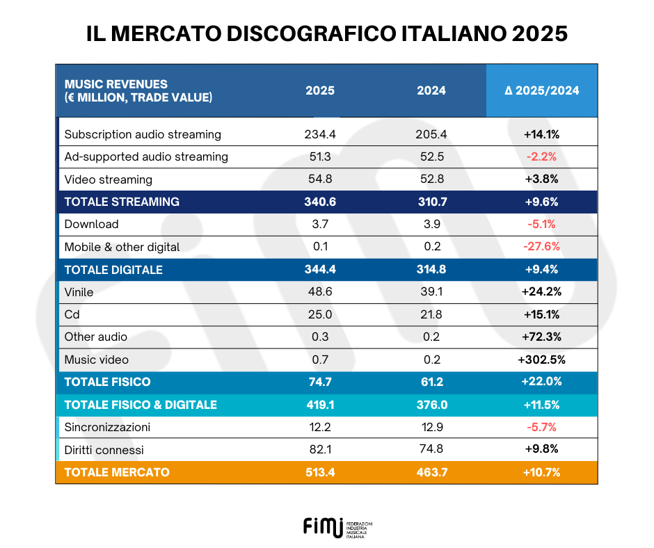 - 513,4 milioni di euro: valore record del mercato della musica registrata in Italia nel 2025 (+10,7%)